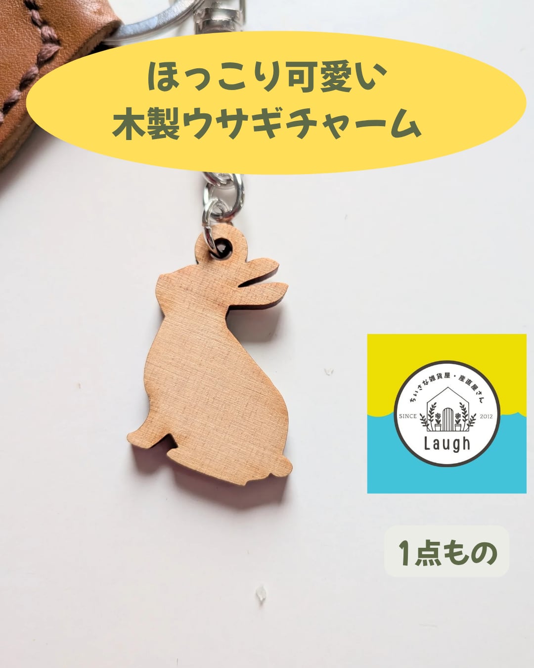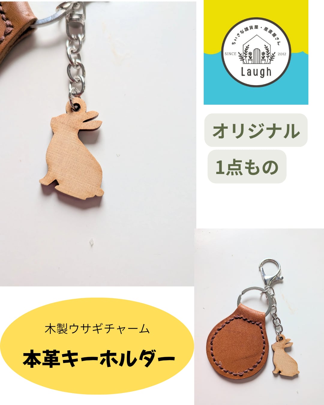 ◎本革と木製のウサギデザインチャームとのコンビネーションが特徴のキーホルダーです。