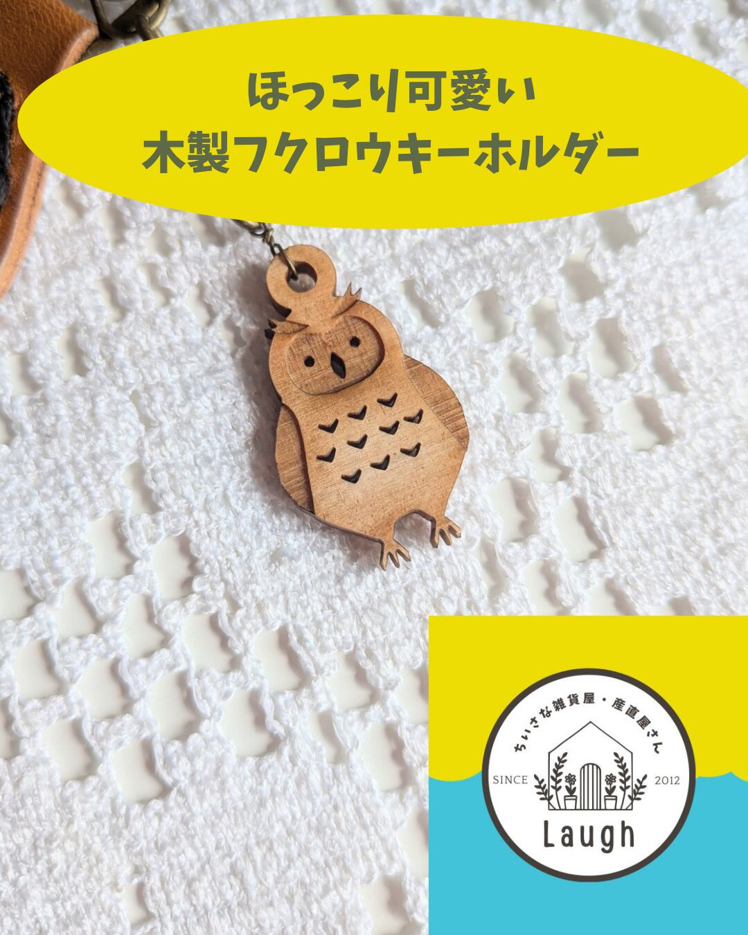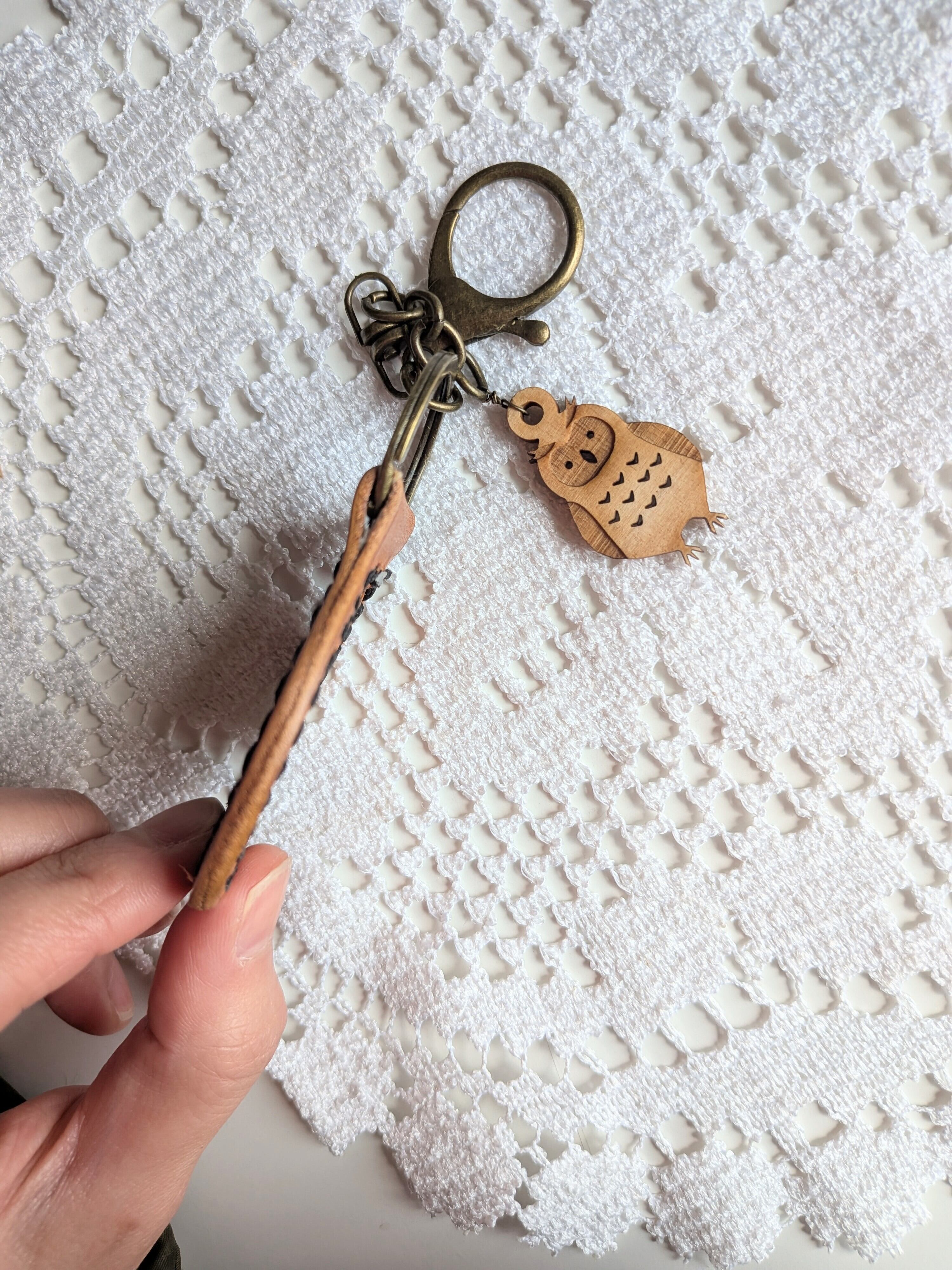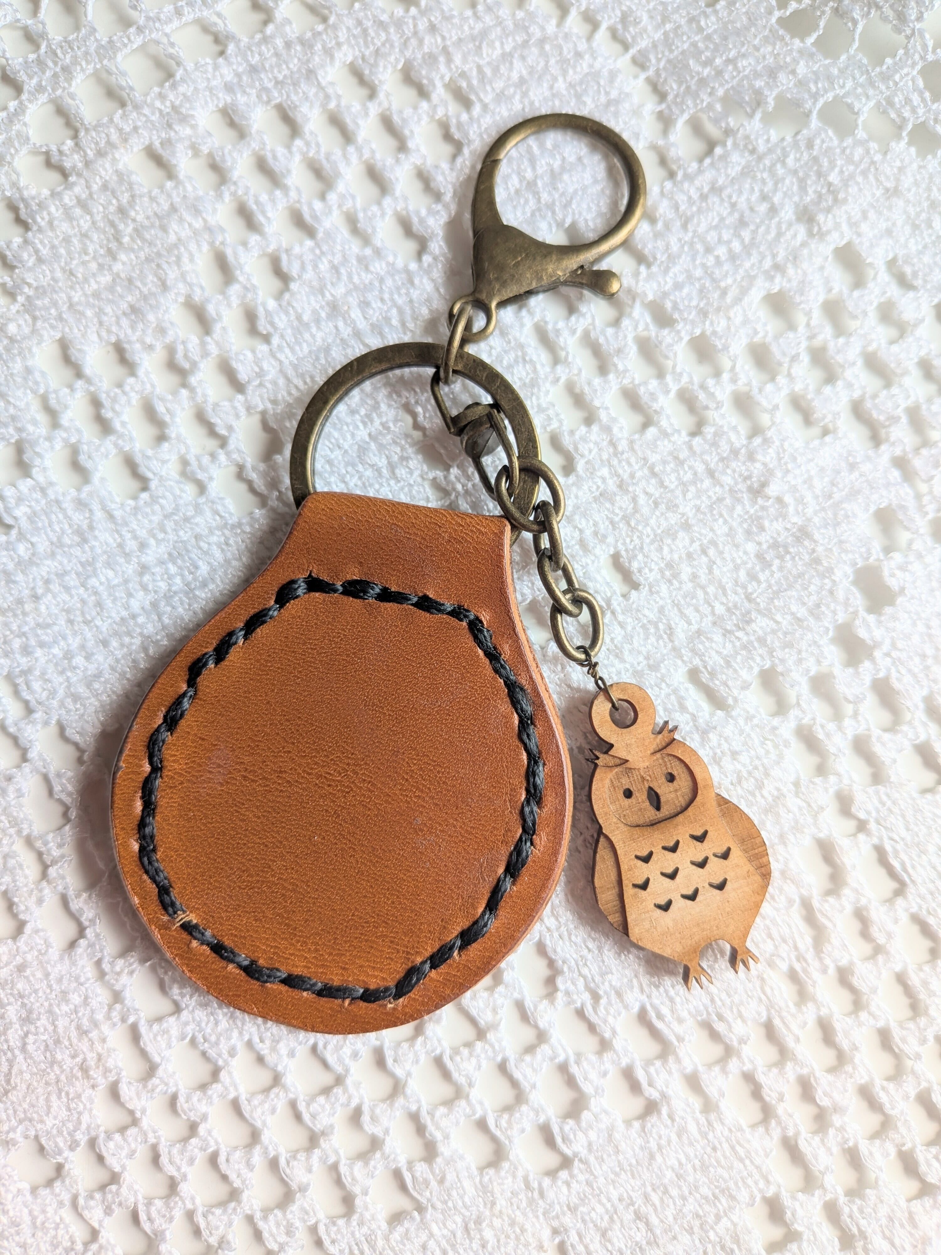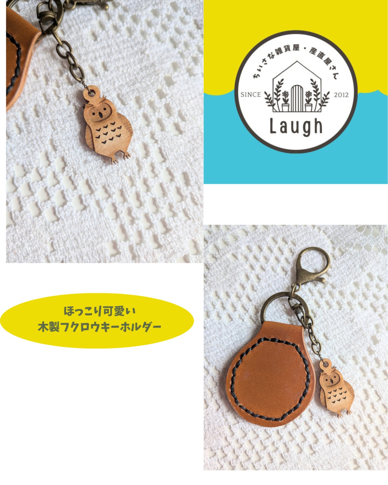 ◎本革と木製ミミズクチャーム付きキーホルダーです。温かみのある素材感とほっこりチャームが際立ち、持つことで気分が上がるアイテムです。